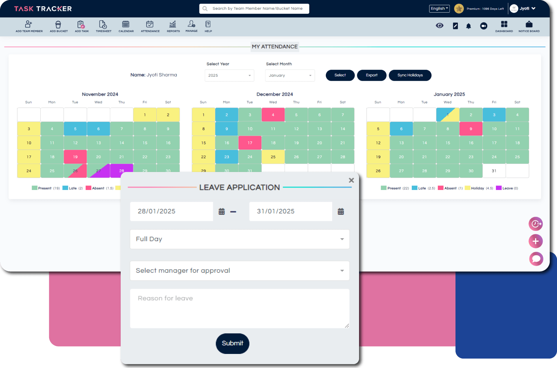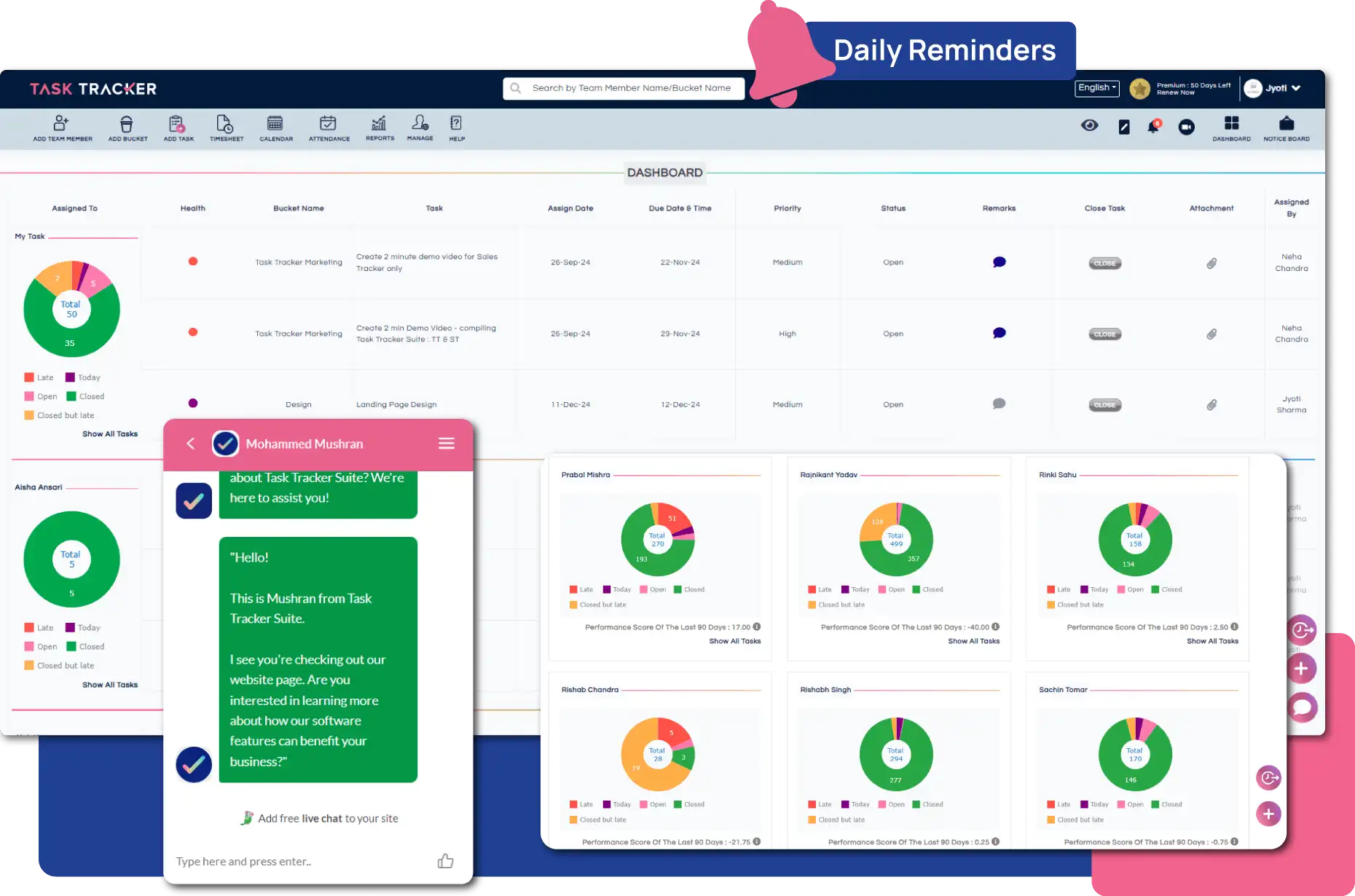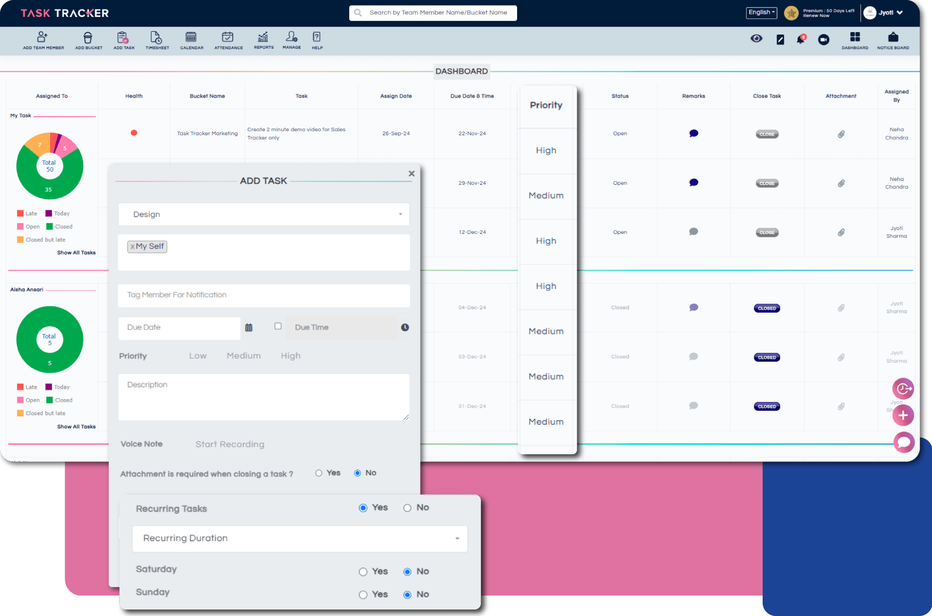 Task Tracker’s task management system streamlines daily activities, ensuring that tasks are assigned, tracked, and completed on time. This improves team coordination, boosts efficiency, and ensures smooth operations.